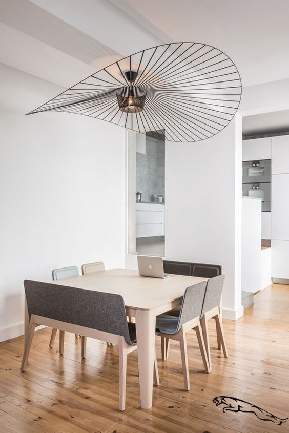 A mesa retangular para 8 ou mais pessoas, define naturalmente hierarquias de posição e de socialização com os lugares